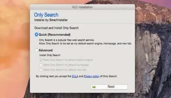 ولكم هذا المثال من حاسوبي : فمثلا انا اريد تتبيث برنامج VLC الشهير في تشغيل الملفات الصوتية والمرئية ( أسرار يمكن أنك لاتعلمها عن برنامج VLC )لكن لاحظوا معي في نافذة التتبيث فإن البرنامج يطلب مني كذلك تتبيث أداة InstallMac. اتعلم ماهو هذا الاخير ؟ إنها عبارة عن أداة فظيعة تجعل الإعلانات في كل مكان في جهازك ، وعندما تذهب للصفحة التالية من التنصيب يريدك أن تنصب برنامج خبيث آخر والصفحة التالية أيضًا شيء آخر ، شيء يشيب منه الرأس .